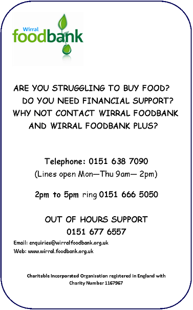 If you need emergency food support, you can call Wirral Foodbank on 0151 638 7090 (Monday to Thursday 10am – 1.30pm, excluding Bank Holiday), Citizens Advice Wirral on freephone 0808 278 7848 or the Wirral Council Helpline on 0151 666 5050. You can also get assistance by visiting local libraries (please check opening times of libraries https://www.wirral.gov.uk/libraries-and-archives/find-library