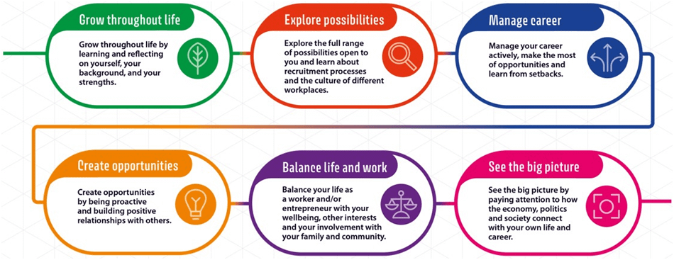 When developing Kilgarth’s programmes of study, careers teams have mapped against the CDI’s Career Development Framework and its six learning outcomes; how does it help clients grow throughout life, explore possibilities, manage their career, create opportunities, balance life and work and see the big picture. Each activity may develop different skills, but programmes ensure engagement with all of these learning areas. This is shown in the colour matching of the lessons.