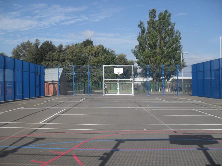 Frames are safe and vandal resistant in weather-proof steel, finished off with a powder-coated finish in bright appealing colours. It contains goal units, basketball backboards and hoops and there are markings for football, rugby, basketball, cricket and tennis. Pupils can also play badminton and volleyball in there.